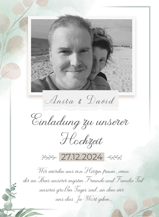 Diese wunderschön gestaltete Hochzeitseinladung für euch (Anita und David) bietet die perfekte Möglichkeit, Freunde und Familie zu einem der bedeutendsten Anlässe in euren Leben einzuladen. Die Einladung verbindet Natürlichkeit mit Eleganz und schafft eine warme, einladende Atmosphäre.